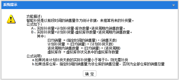 计划补货天数、进货周期由用户指定。若选择某仓库,则计算该仓库的销售情况,否则为全部仓库的销售情况。