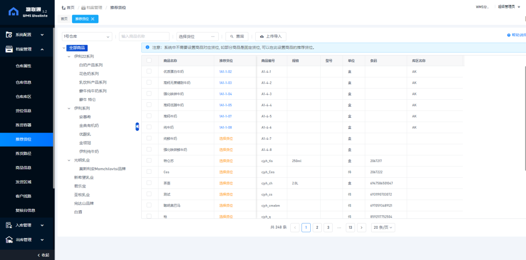 商品固定货位存放时,可在物联通WMS中为每个商品设置推荐货位